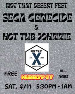 This Saturday, Hot Tub Johnnie posts up at Brewery X with SEGA Genecide - (Southern California's Best 90's - 00's Live Band Experience) for Day 2 of the Not That Desert Festival. Throwback party fun, all ages, 5:30pm to 1am, we'll go hard, come on out.
